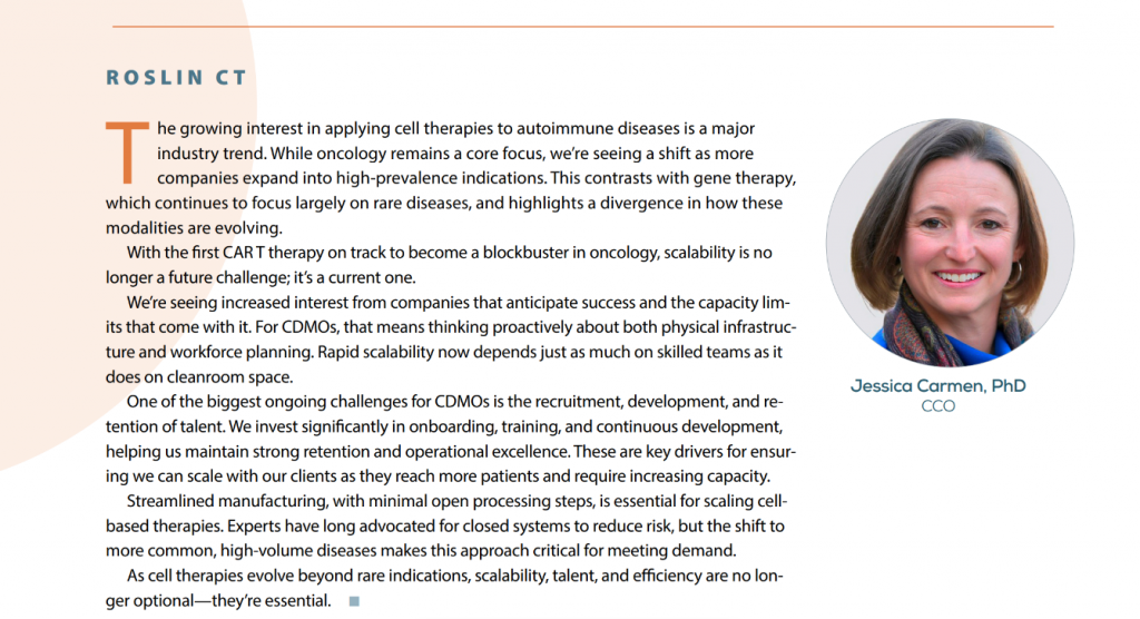 Our CCO, Jessica Carmen, highlights how the evolution of cell therapies beyond rare diseases is making scalability, skilled teams, and streamlined manufacturing essential for meeting growing demand.